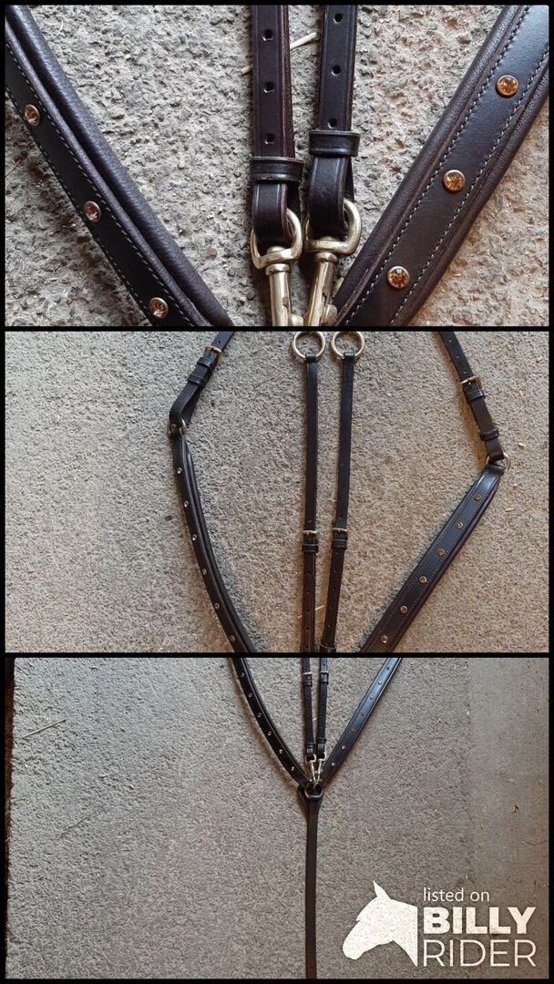 Das multifunktionelle Vorderzeug Saumur ist aus weichem Qualitätsleder hergestellt und verhindert ein Zurückrutschen des Sattels und hält ihn in Position. Besonders praktisch ist die durch Karabinerhaken abnehmbare Martingalgabel, dadurch auch besonders geeignet für das Barock-Outfit. Eine weiche Polsterung an den Seitenteilen und dem Druckpunkt an der Brust verhindern Scheuerstellen. Das Vorderzeug ist durch Dornschnallen vielfach größenverstellbar und durch Snap-Karabiner am Sattel zu befestigen. Sehr edel wirken die funkelnden Strass-Steine des Vorderzeugs Saumur und vervollständigen so jeden Look. War einmal am Pferd Neupreis 69 Euro Privatverkauf, keine Garantie oder Gewährleistung