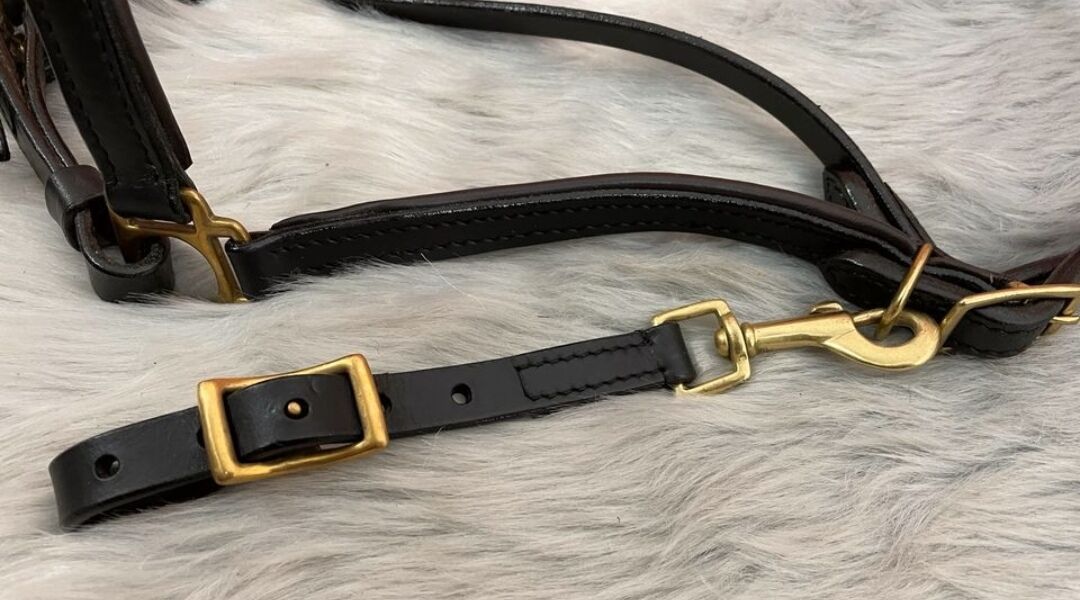 Schwarzes Leder mit goldenen Beschlägen und inkl. Zügel und Bithanger zum Einhängen eines Gebisses