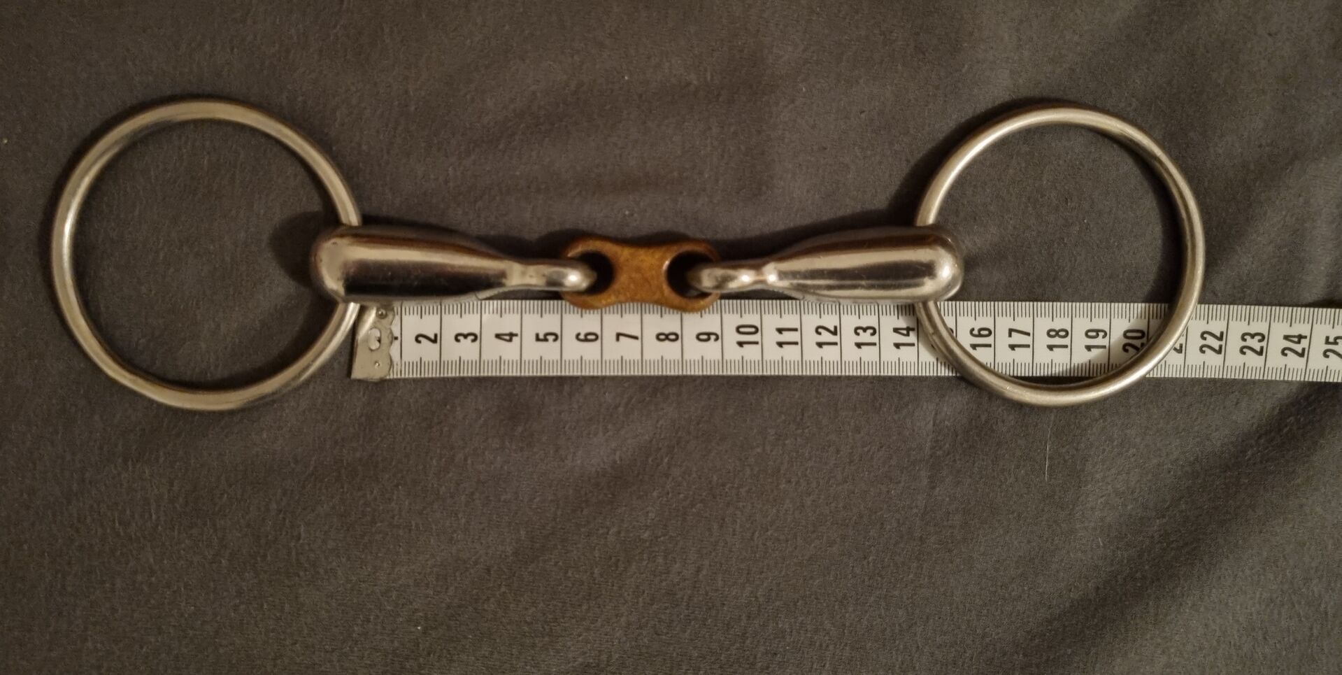 Ich verkaufe mein doppeltgebrochenes Wassertrensengebiss mit flachem Mittelstück aus Kupfer und rostfreie Edelstahlringen. Das Gebiss hat eine Länge von 14,0 cm und eine Gebissstärke von 16 mm. Der Ringdurchmesser von innen beträgt 67 mm.