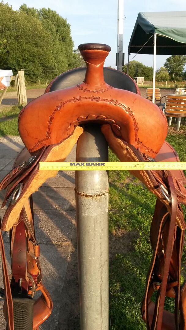 schöner großer Sattel, honigbraun, kaum Gebrauchsspuren, leider passt er meiner Freibergerstute nicht, mittel bis wenig Schwung, Kammer 7", Full Quarter Baum, Sitzgröße 16", Abstand Conchas 21 cm, Gesamtlänge 66 cm, vorgedrehte Fender mit Steigbügeln, NP 3.000,- € Dies ist ein Privatverkauf.