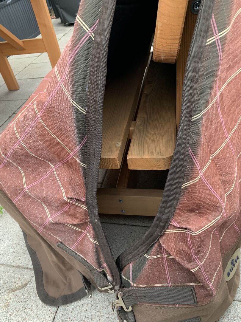 Hier eine Winterdecke von Busse mit 300gr Füllung und 155cm Länge. Sie ist frisch gewaschen und imprägniert. Sie war mehrere Jahre im Winter im Einsatz. Sie hat einen großen Halsausschnitt und damit gute Bewegungsfreiheit für Schulter und Hals. Mein Pferd hat sie geliebt.