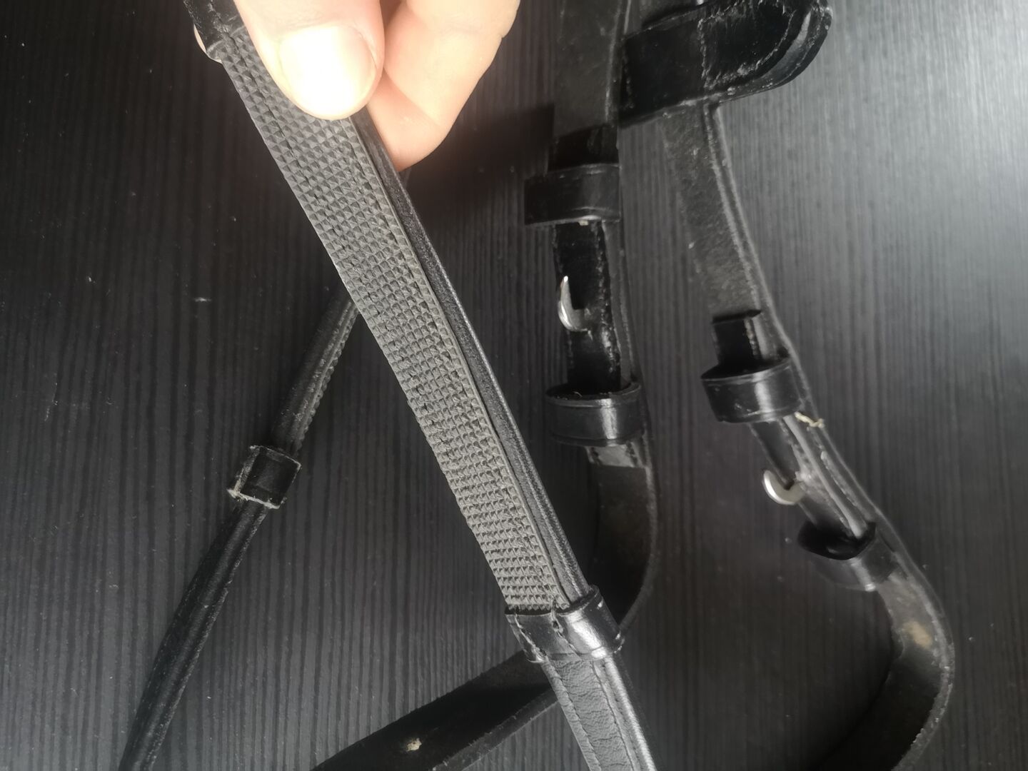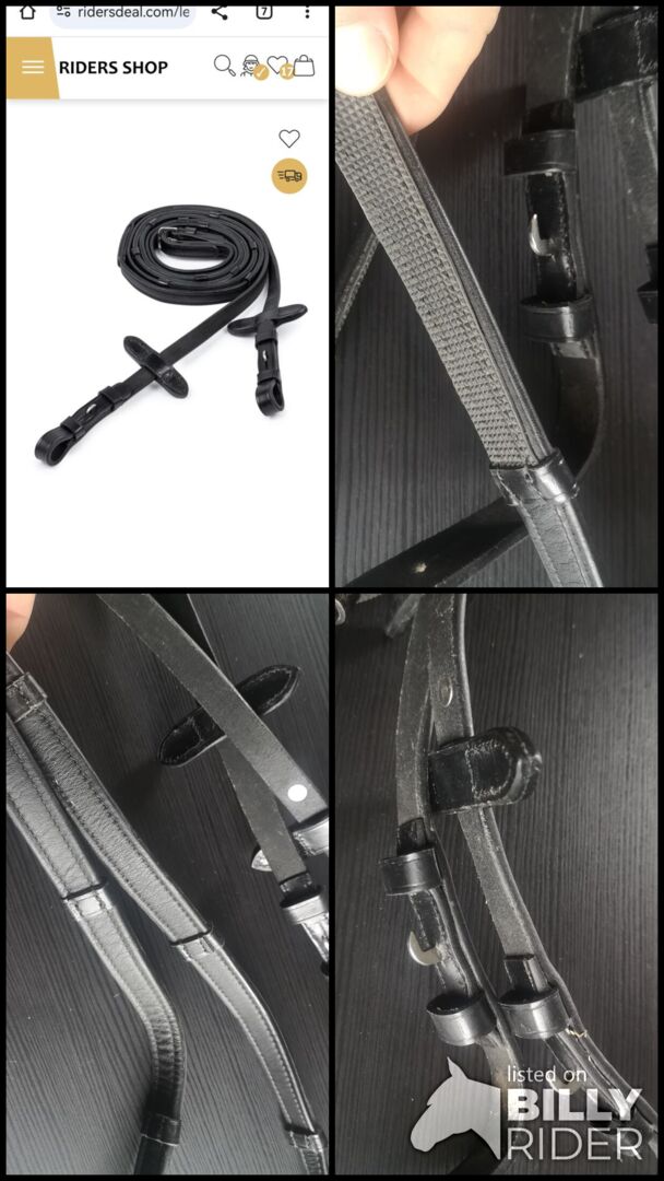 Zügel mit echtleder weich Innenseite Gummi für den antislip einfach mit harken System zu verschließen. Habe ich zweimal benutzt. Habe mich dennoch für andere entschieden. Neupreis 38 Euro. Vollblut 280cm lang